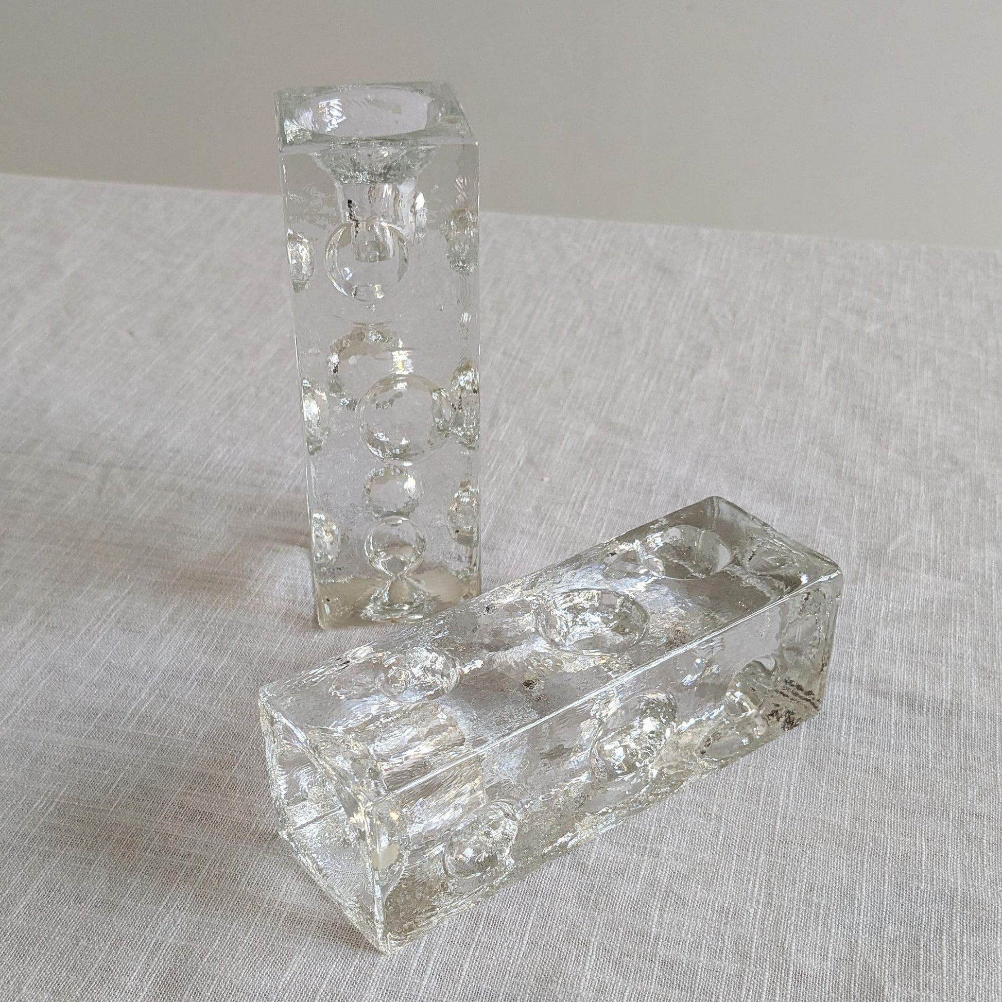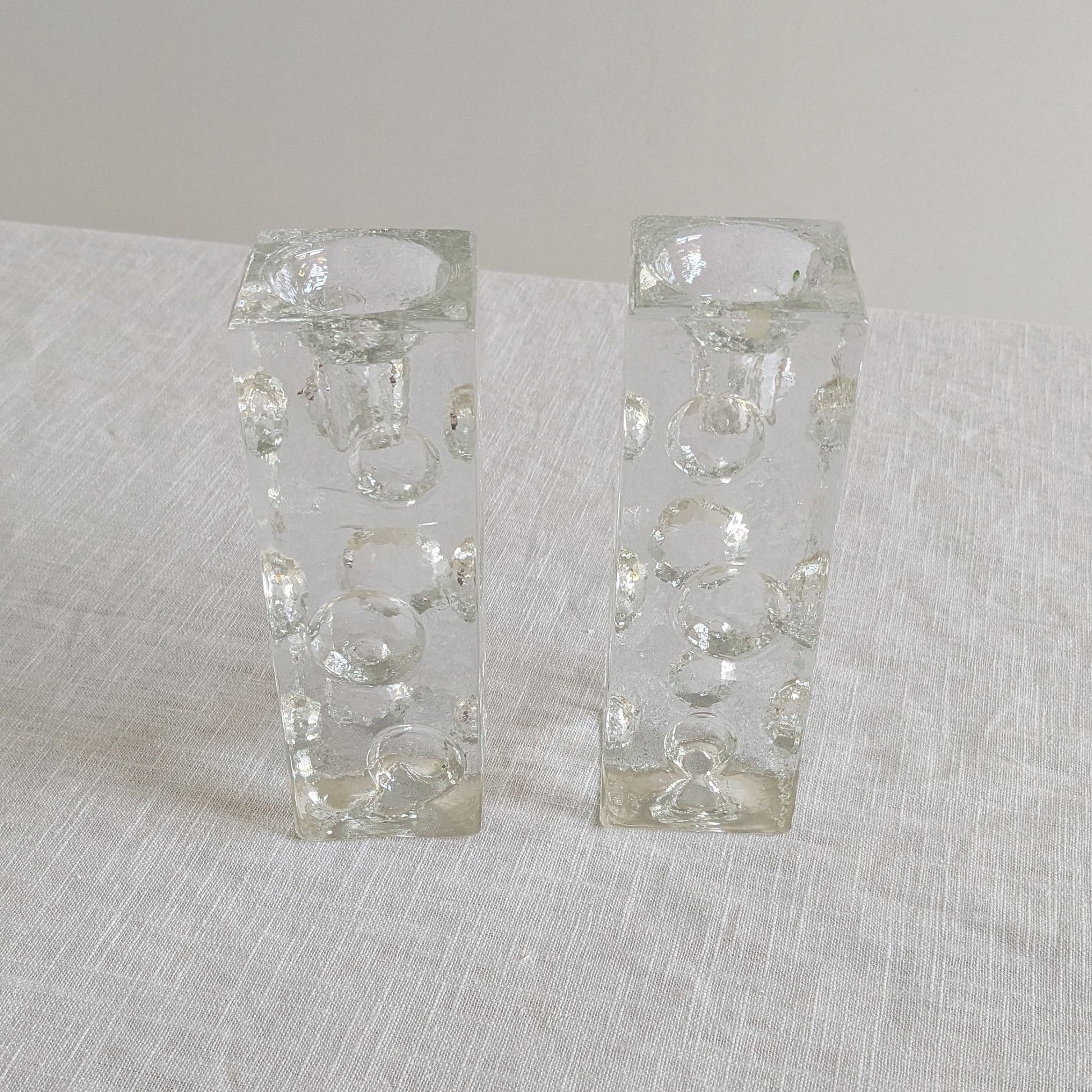 A pair of mid century chunky art glass candlesticks resembling blocks of ice with relief circles. Perfect for a festive tablescape or mantle decor.